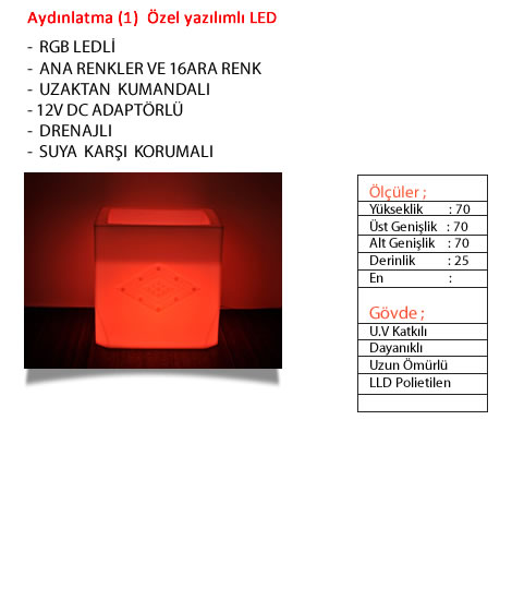 Karmod üretimi olan dekoratif polietilen isikli saksilar özel tasarlanmis üretimi, isik dagilimi ve farkli renkleriyle mimari uygulamalarda konuldugu yerlere güzellik ve kalite katmaktadir. Karmod isikli saksilarin yüzeyine farkli dekoratif desen uygulamasi da yapilabilmektedir. Polietilen dekoratif isikli saksilarimizin üst kismi toprak haznesiyle canli çiçek veya bitki yetistirilebilecek sekilde tasarlanmis olup fazla su tahliye baglantisi da mevcuttur. Canli çiçek haznesine arzu edilirse dekoratif süs taslariyla hazir çiçek uygulamasi da kolayca yapilabilmektedir. Renkli isik sistemiyle geceleri renkli aydinlatmalara imkan sunmaktadir.